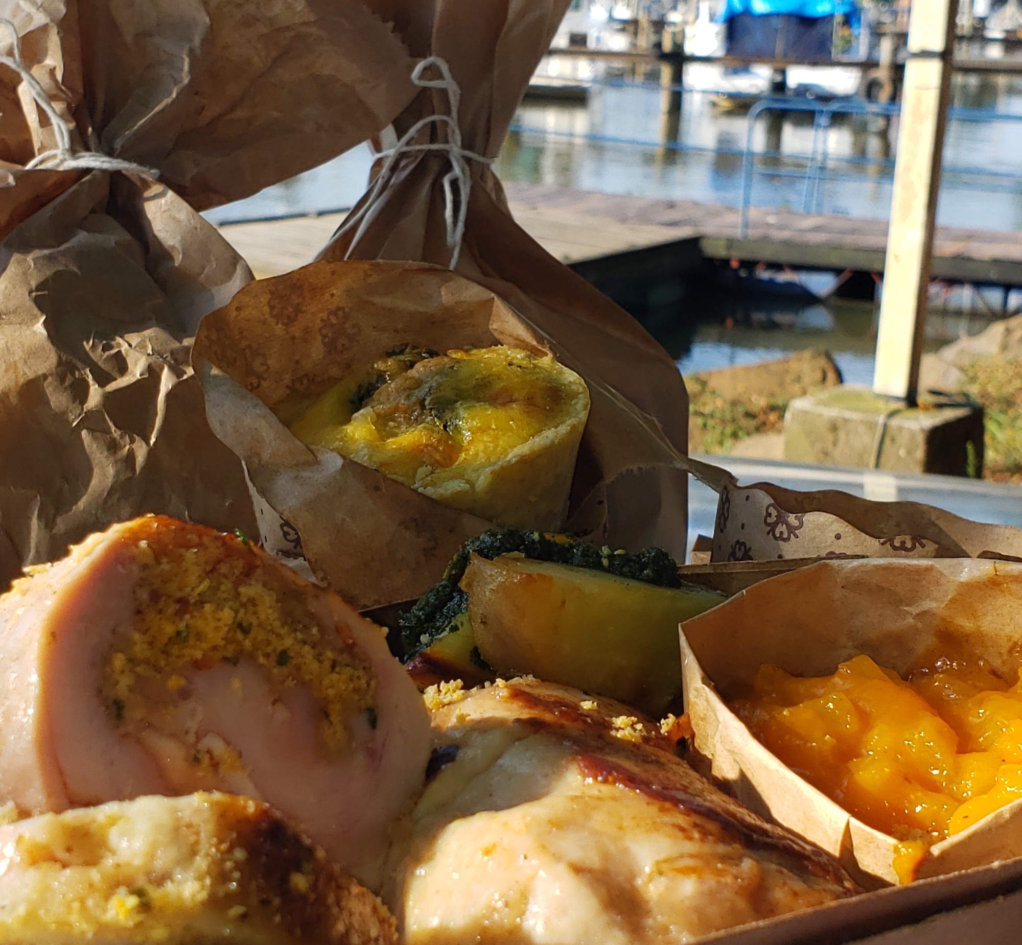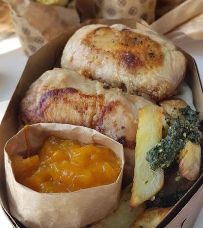 - Ballotine ou quitute de ave recheada com farofa de bacon, chutney de maça e manga e salada de batata doce com pesto.
